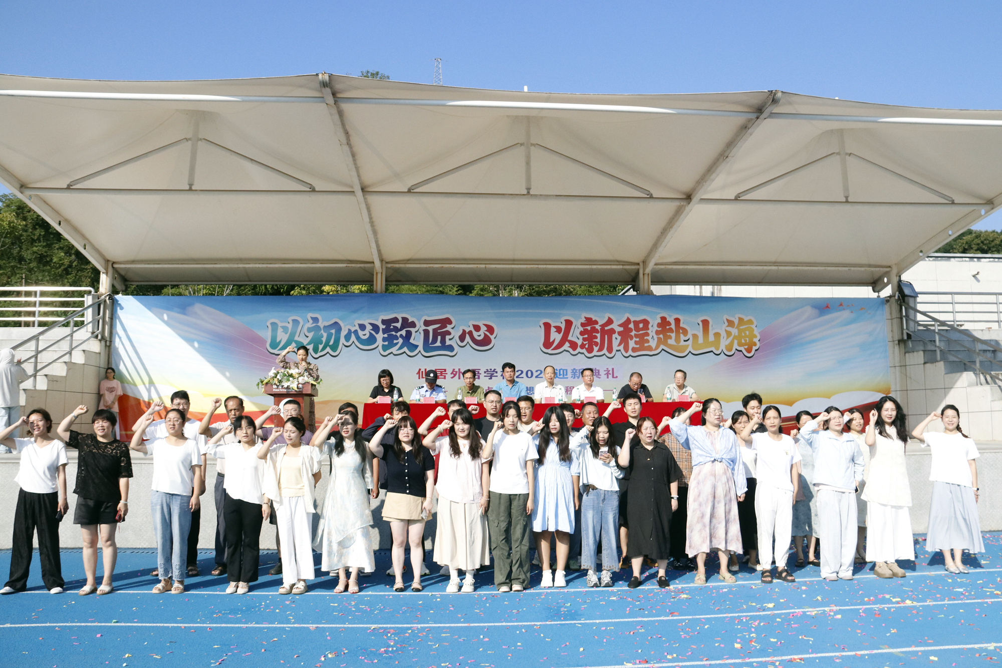 “我是仙外教師,我是社會(huì)中堅(jiān),我以仙外為榮,我以教育為樂(lè),愛(ài)崗敬業(yè),為人師表,嚴(yán)謹(jǐn)治學(xué),竭盡所能,崇尚科學(xué),追求真理,勤奮努力,勇于創(chuàng)新,以生為本,學(xué)為中心,教書育人,樂(lè)于奉獻(xiàn),為學(xué)生的人生幸福奠基,為教師的職業(yè)生涯增色,為仙外的事業(yè)發(fā)展添彩!”初一、高一全體教師高舉右拳,莊嚴(yán)宣誓。鏗鏘的誓言穿越校園,是對(duì)教育事業(yè)的忠誠(chéng),更是對(duì)學(xué)子未來(lái)的承諾——他們將以行動(dòng)踐行誓言,守護(hù)每一份成長(zhǎng)。