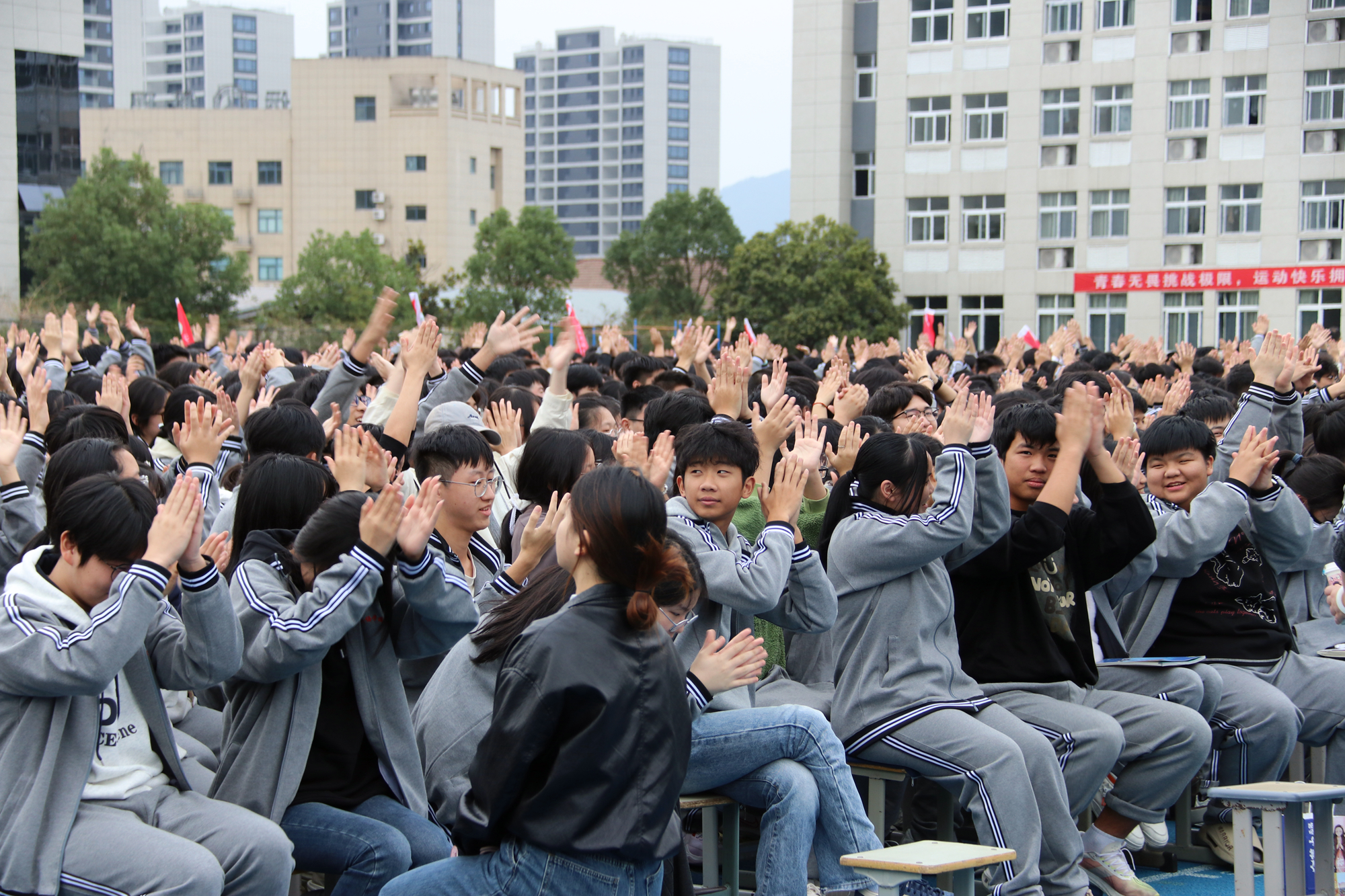 整場(chǎng)演講中,趙老師采用互動(dòng)性極強(qiáng)的形式,讓同學(xué)們?cè)诔两襟w驗(yàn)中感悟成長(zhǎng)。當(dāng)"互相拍肩點(diǎn)贊"的暖流在隊(duì)伍中傳遞,當(dāng)熱烈的掌聲與歡呼聲此起彼伏,那是青春力量的同頻共振;當(dāng)全場(chǎng)閉眼冥想,在靜謐中清空雜念、錨定目標(biāo),每個(gè)人的眼神都多了一份堅(jiān)定;當(dāng)同學(xué)們走向老師,用深深的鞠躬、溫暖的擁抱表達(dá)感恩,師生間的情感在這一刻升華,匯聚成"同向而行、共筑夢(mèng)想"的強(qiáng)大合力;當(dāng)鏗鏘有力的誓言響徹田徑場(chǎng),那是少年們對(duì)理想的勇敢告白,對(duì)未來(lái)的鄭重承諾。